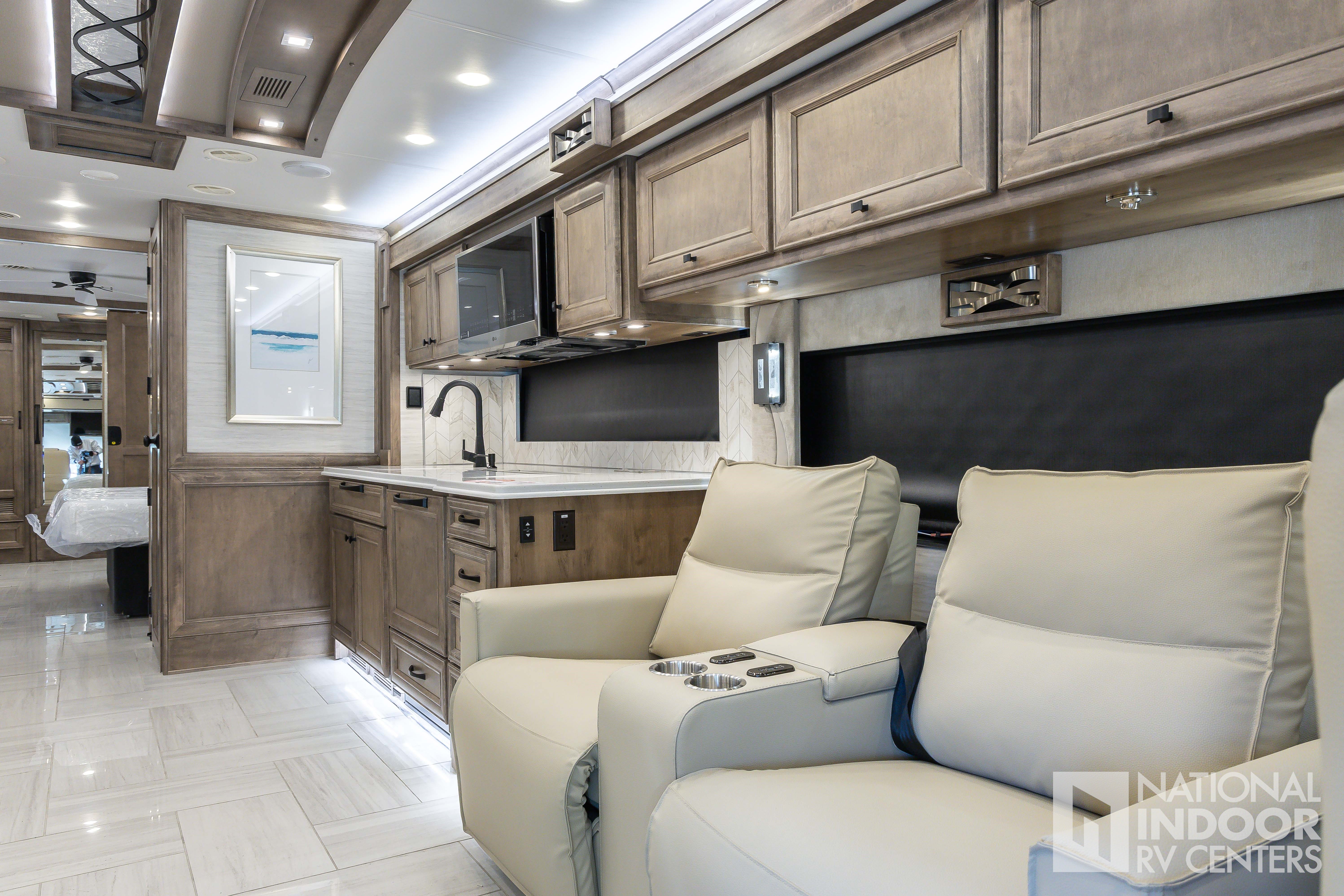 King Bed, Residential Refrigerator & Microwave, Freightliner PowerGlide® XC Raised Rail Rear Engine Diesel Chassis!