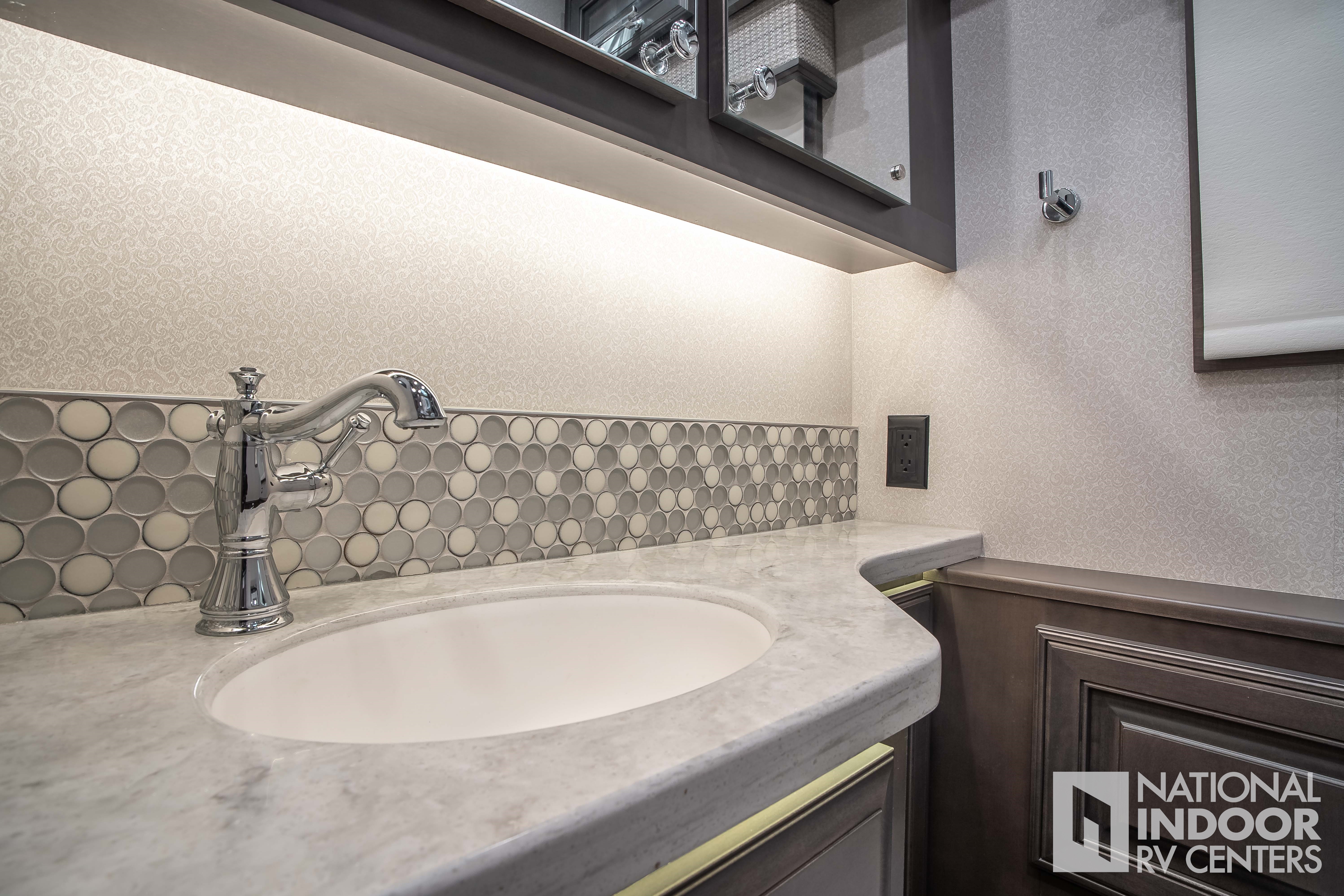 Solid-surface countertops with Blanco single-bowl granite sink and dimmable LED accent lighting