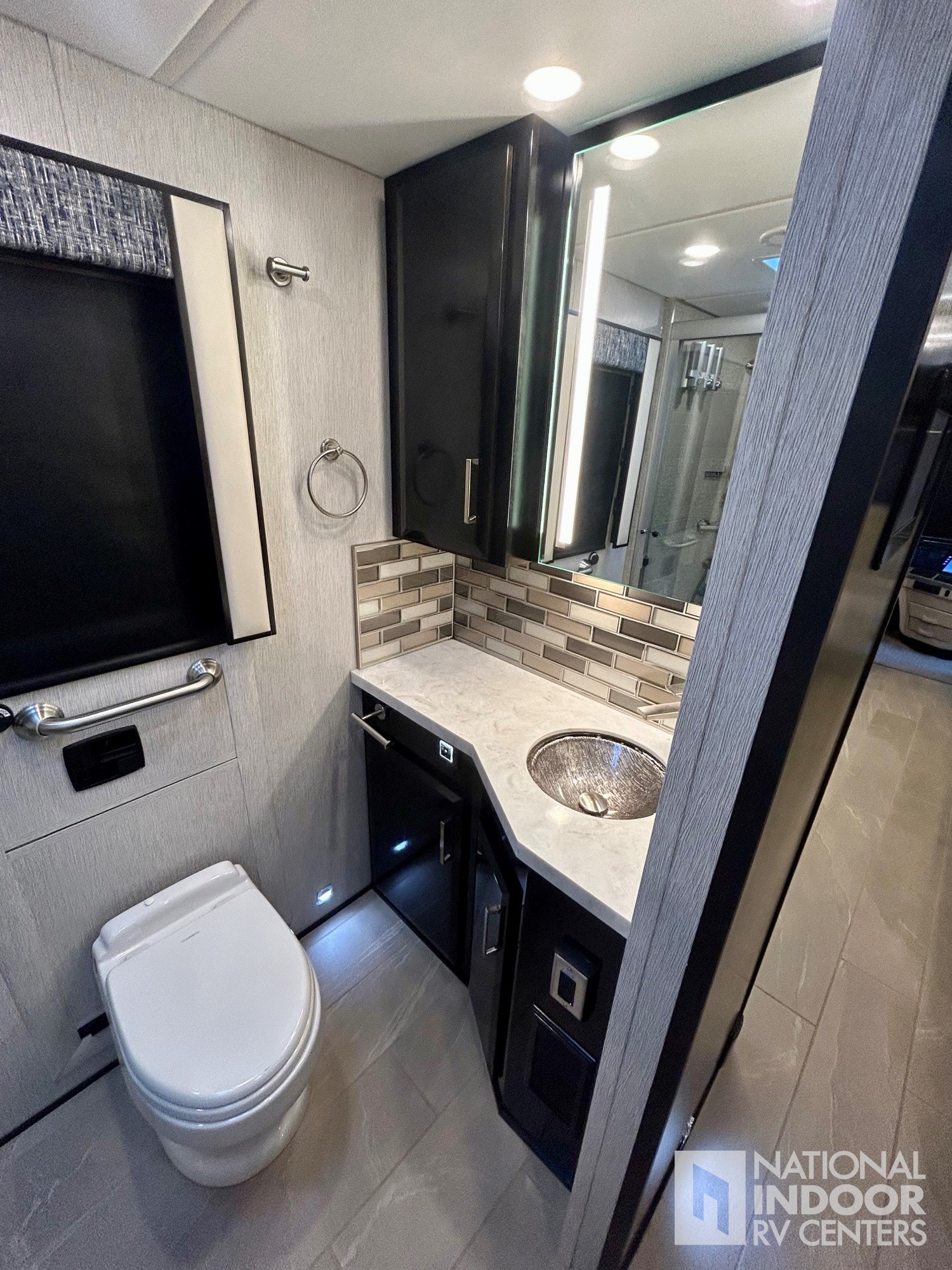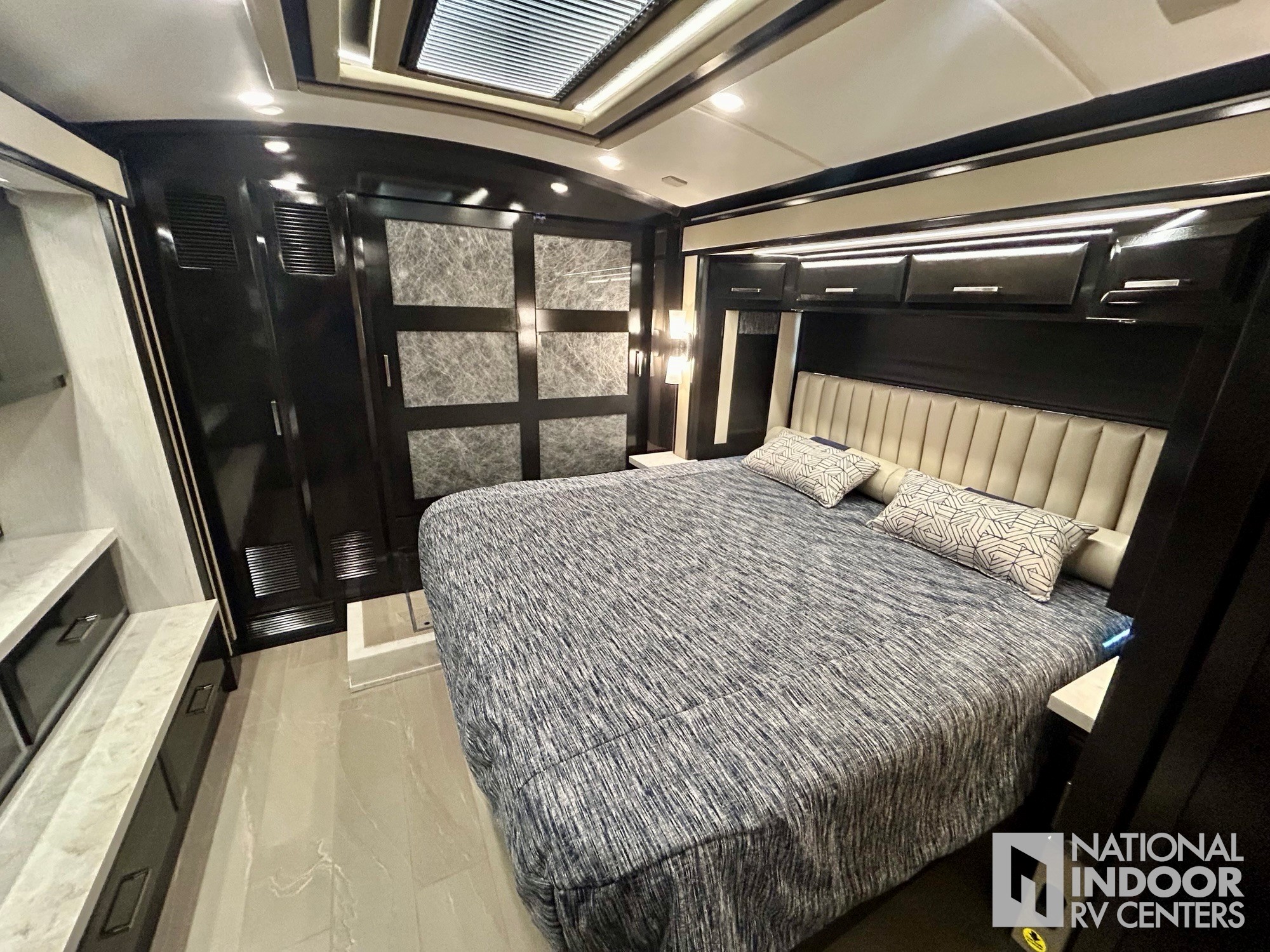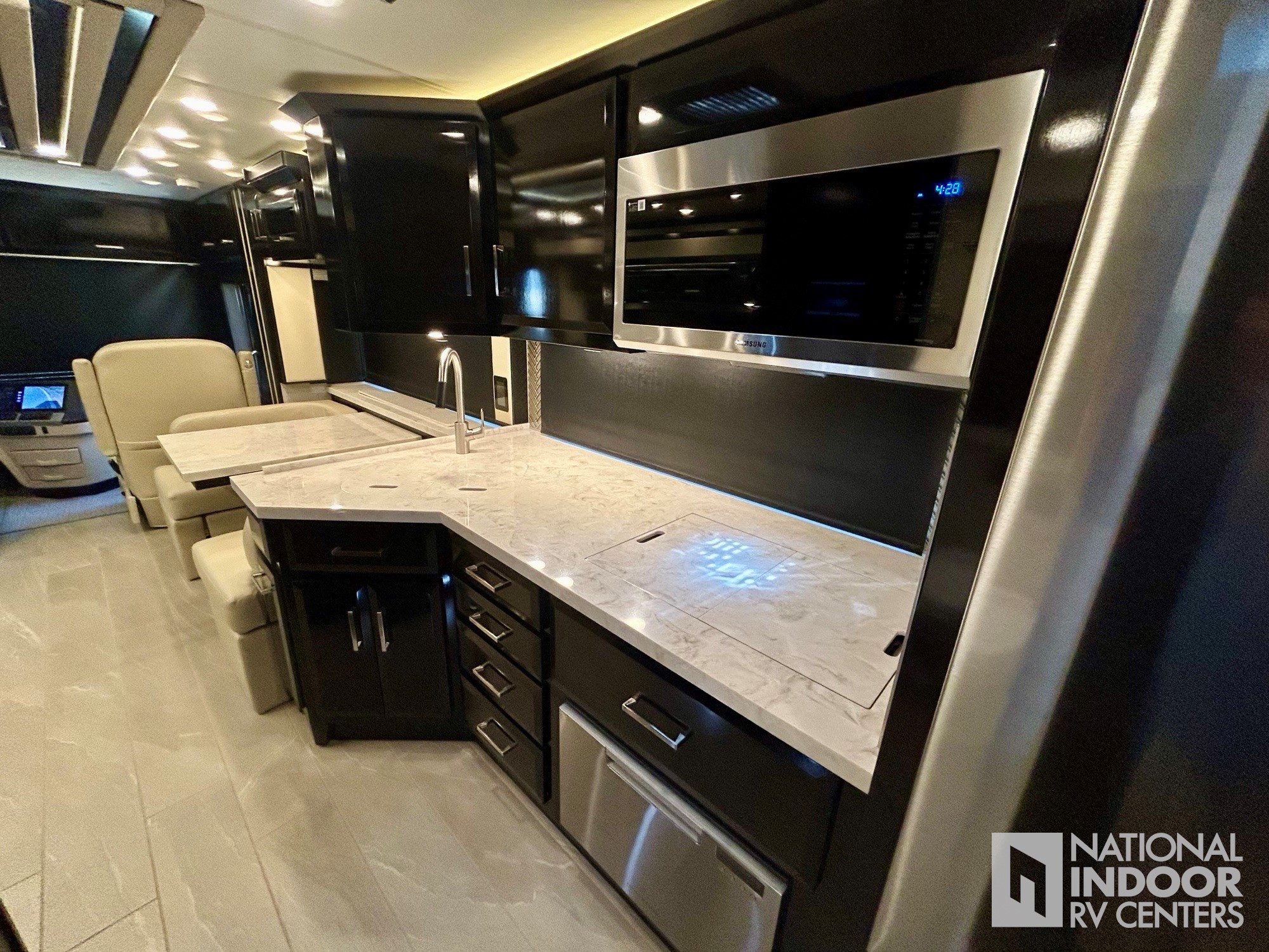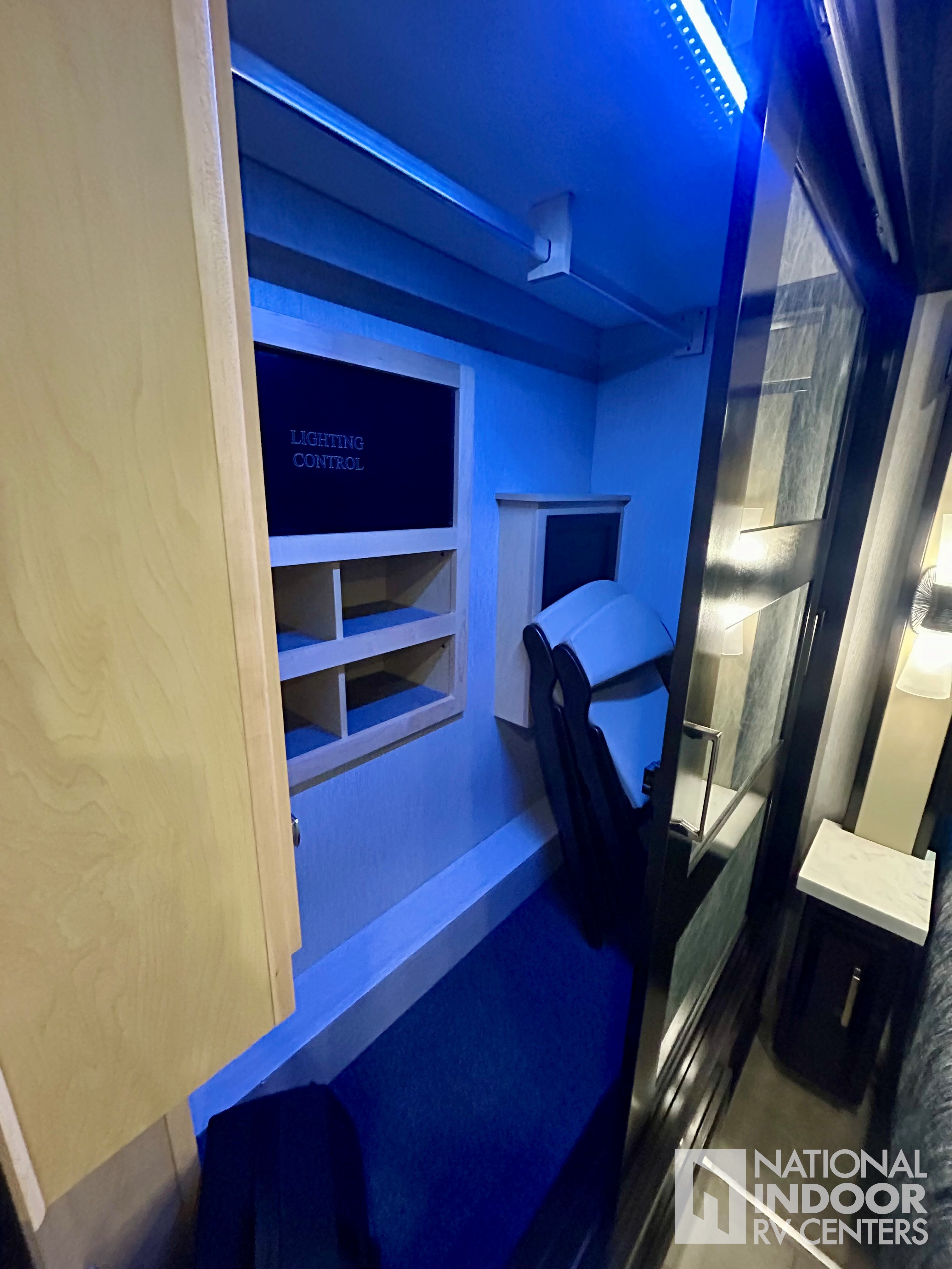 • Purchased new, plugged in and stored inside an insulated aircraft hangar when not on the road. Heated floors, fireplace, Dometic freezer/fridge in basement, televator TV (3 TV’s total), LED headlights, theater seating, dishwasher, washer/dryer, push-button slide-out tray storage in the basement, Sanicon sewerage, 360 degree view camera system, and Girard awnings are just a few of the options.
