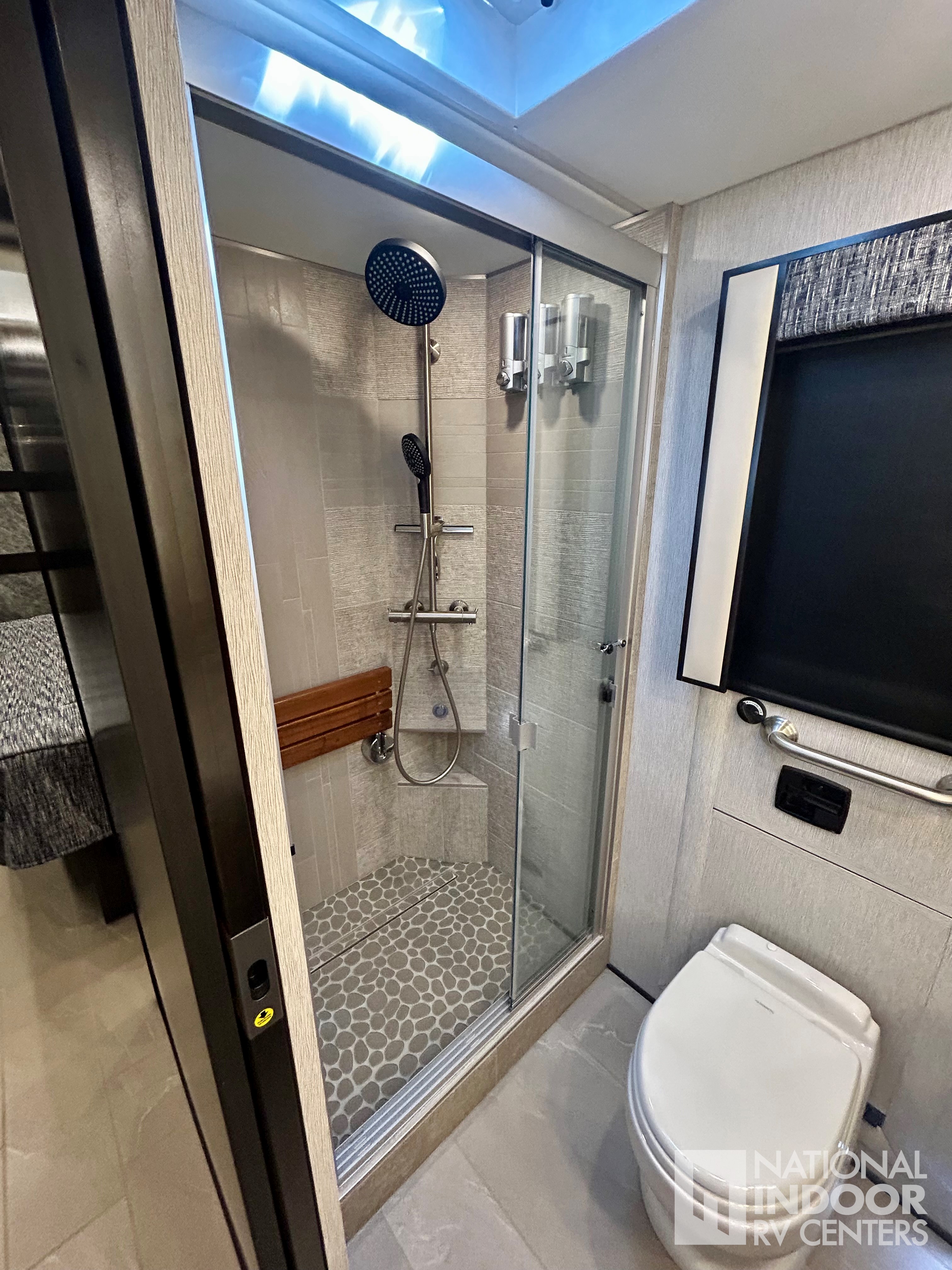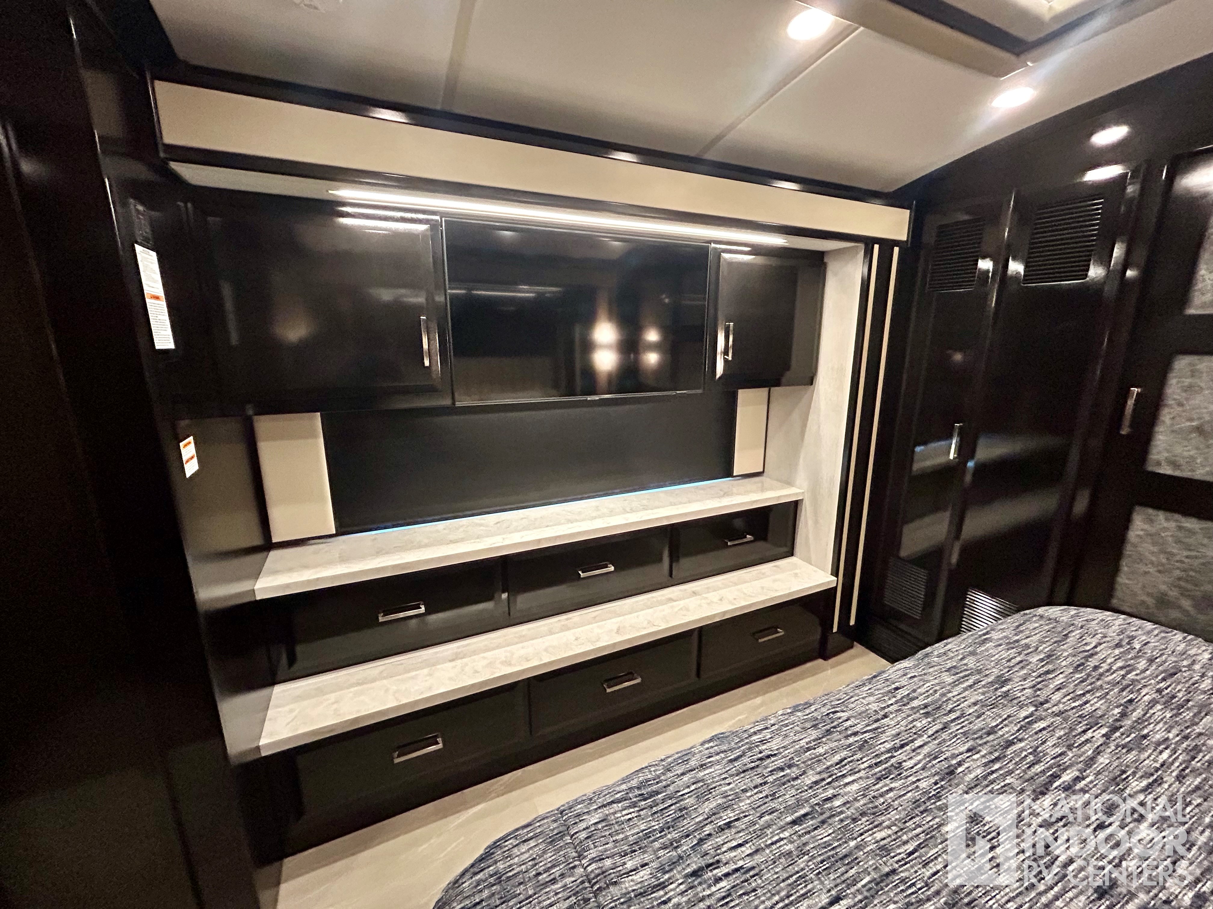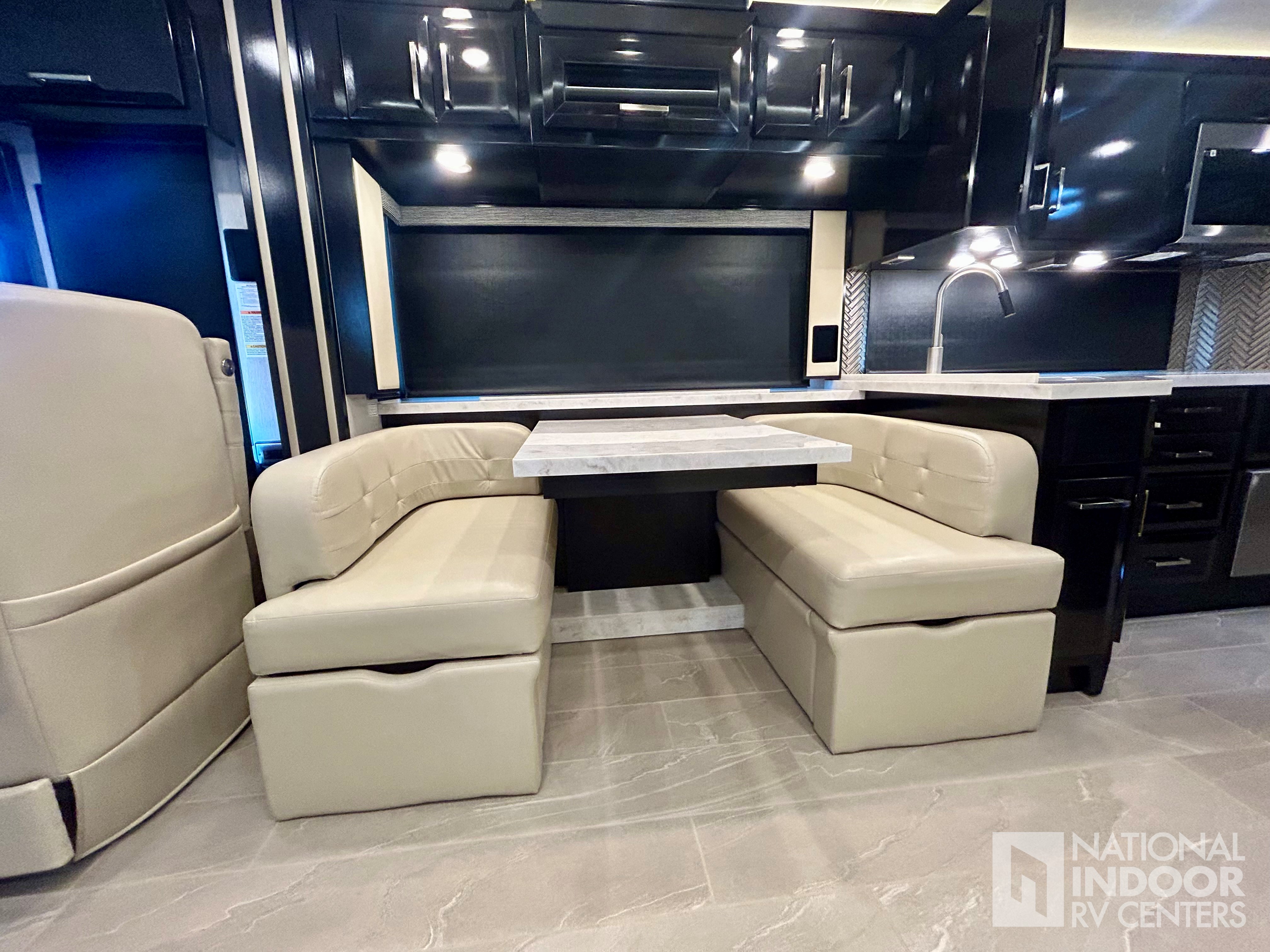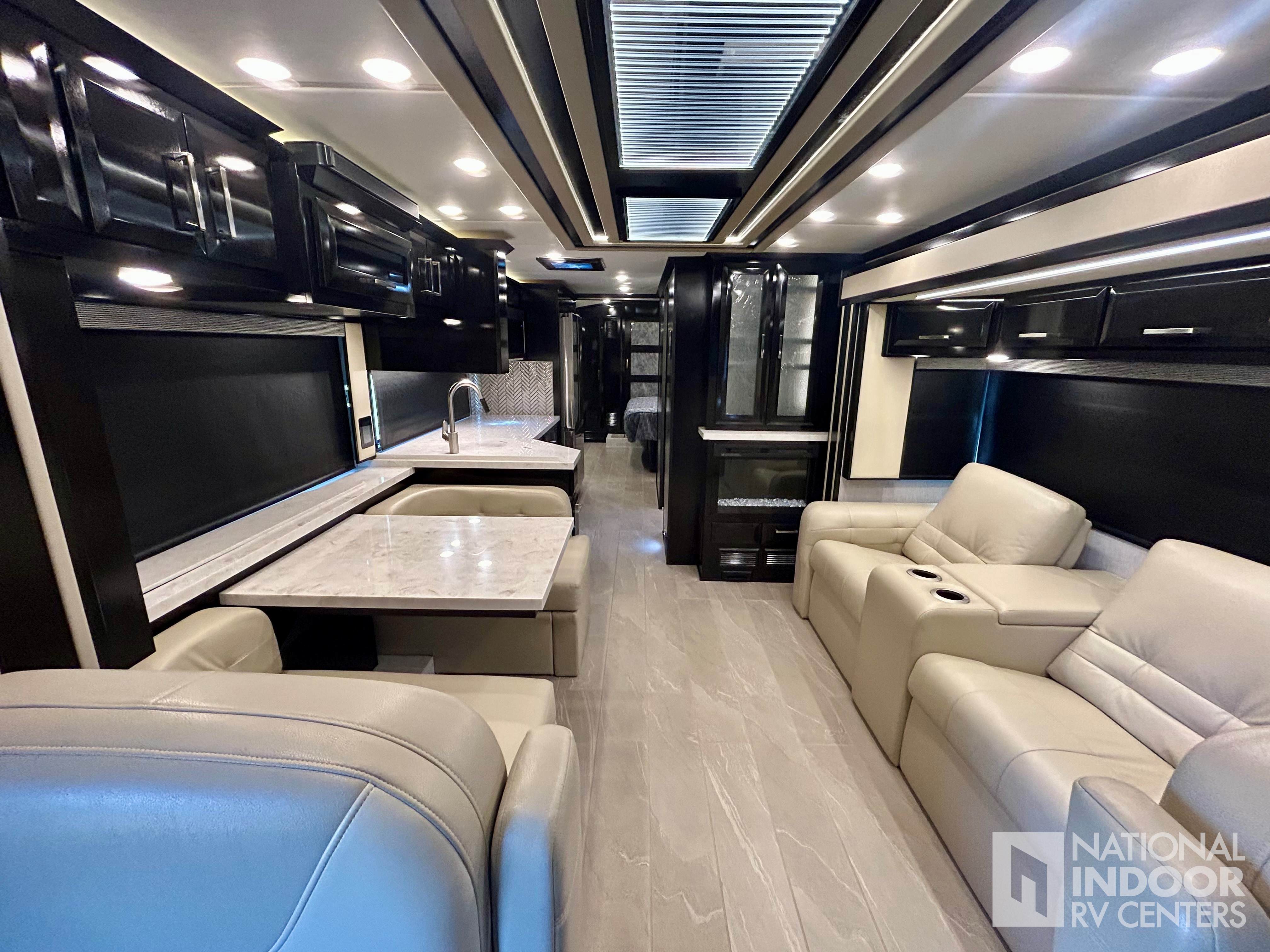 Comfort Drive Steering, 450 HP, Heated floors, Fireplace, Dometic Freezer/Fridge in Basement, Televator TV (3 TV’s total), LED Headlights, Theater Seating, Dishwasher, Washer & Dryer, Push-Button Slide-out Tray Storage in Basement, Sanicon Sewerage, 360 Degree Camera System, Girard Awnings!