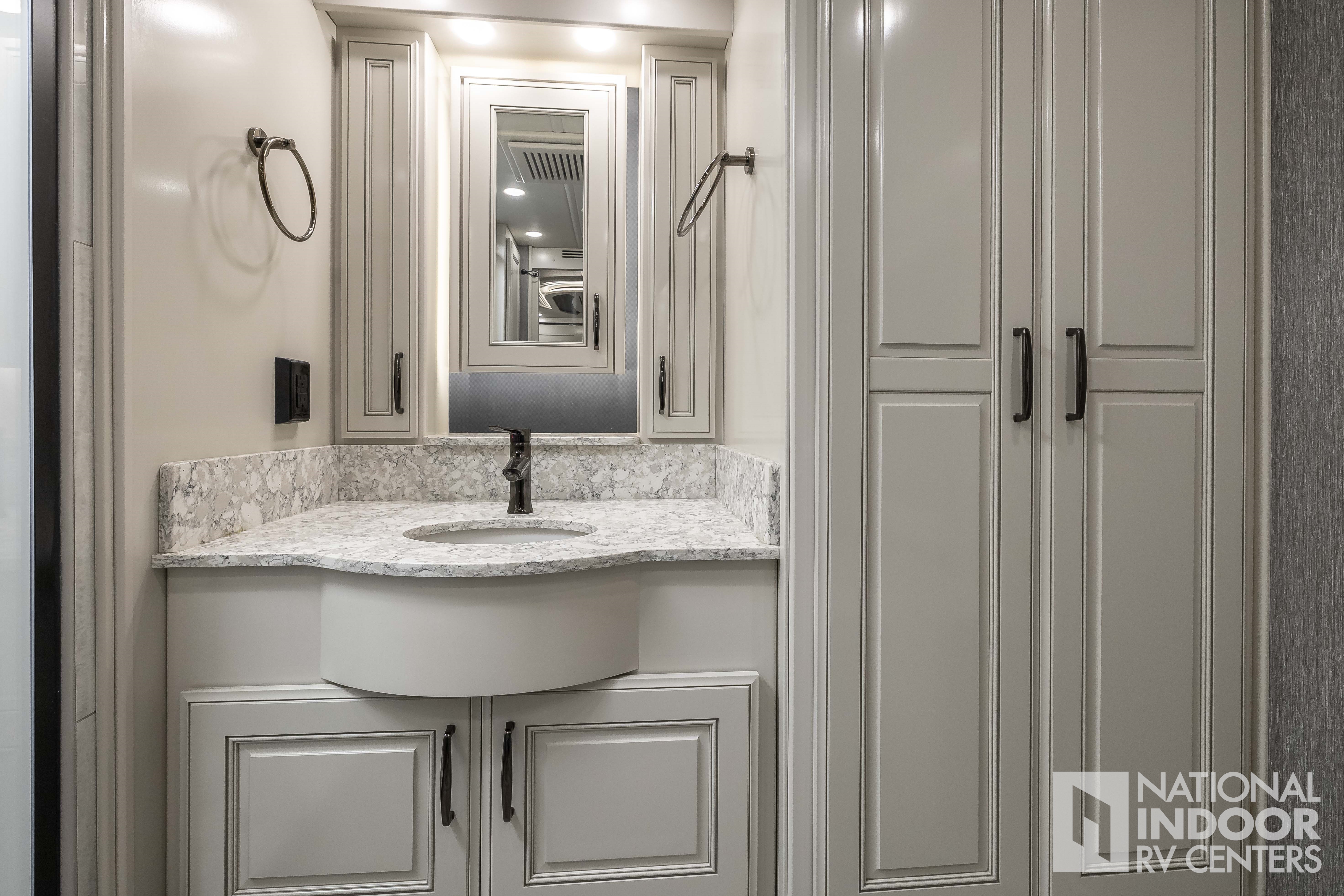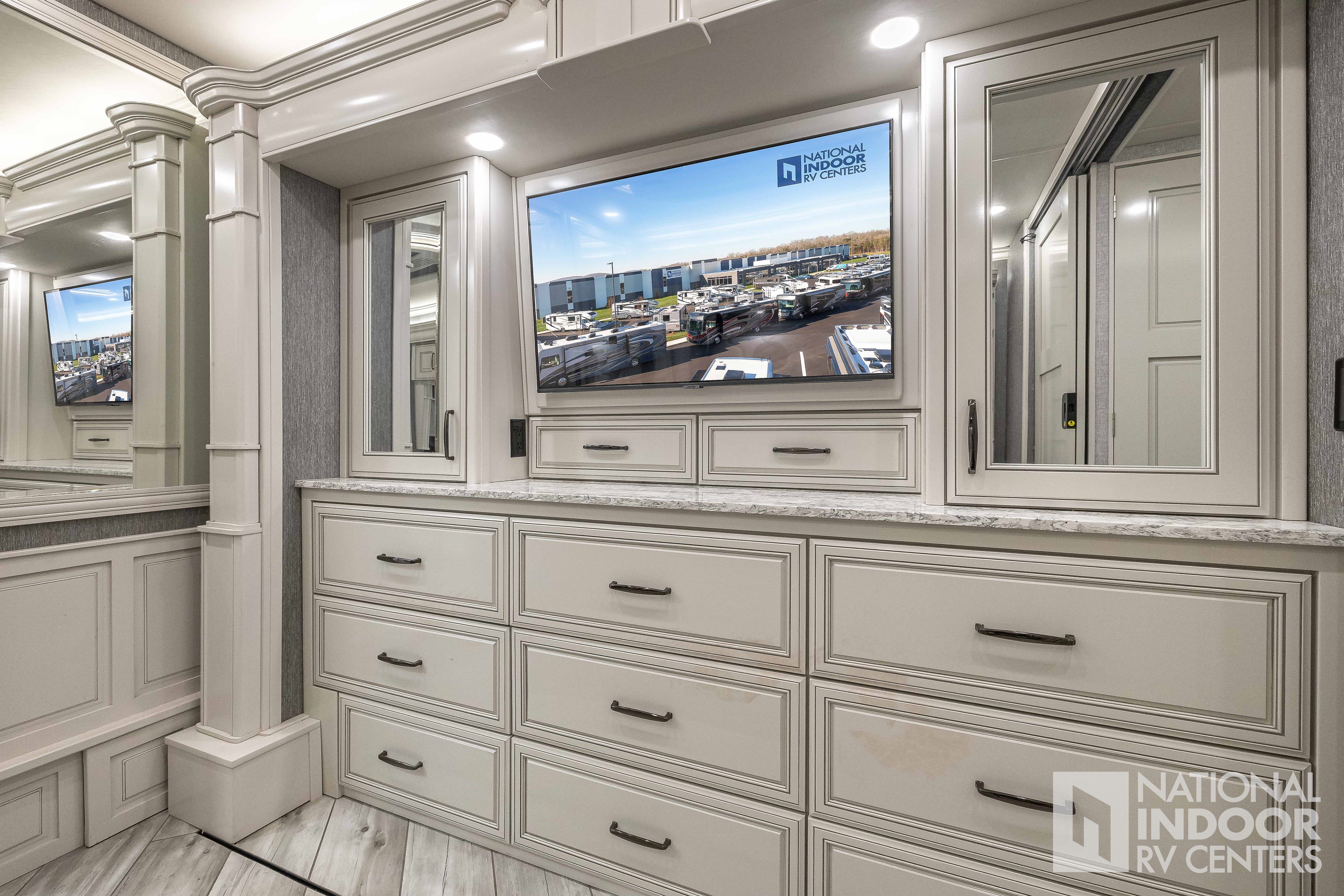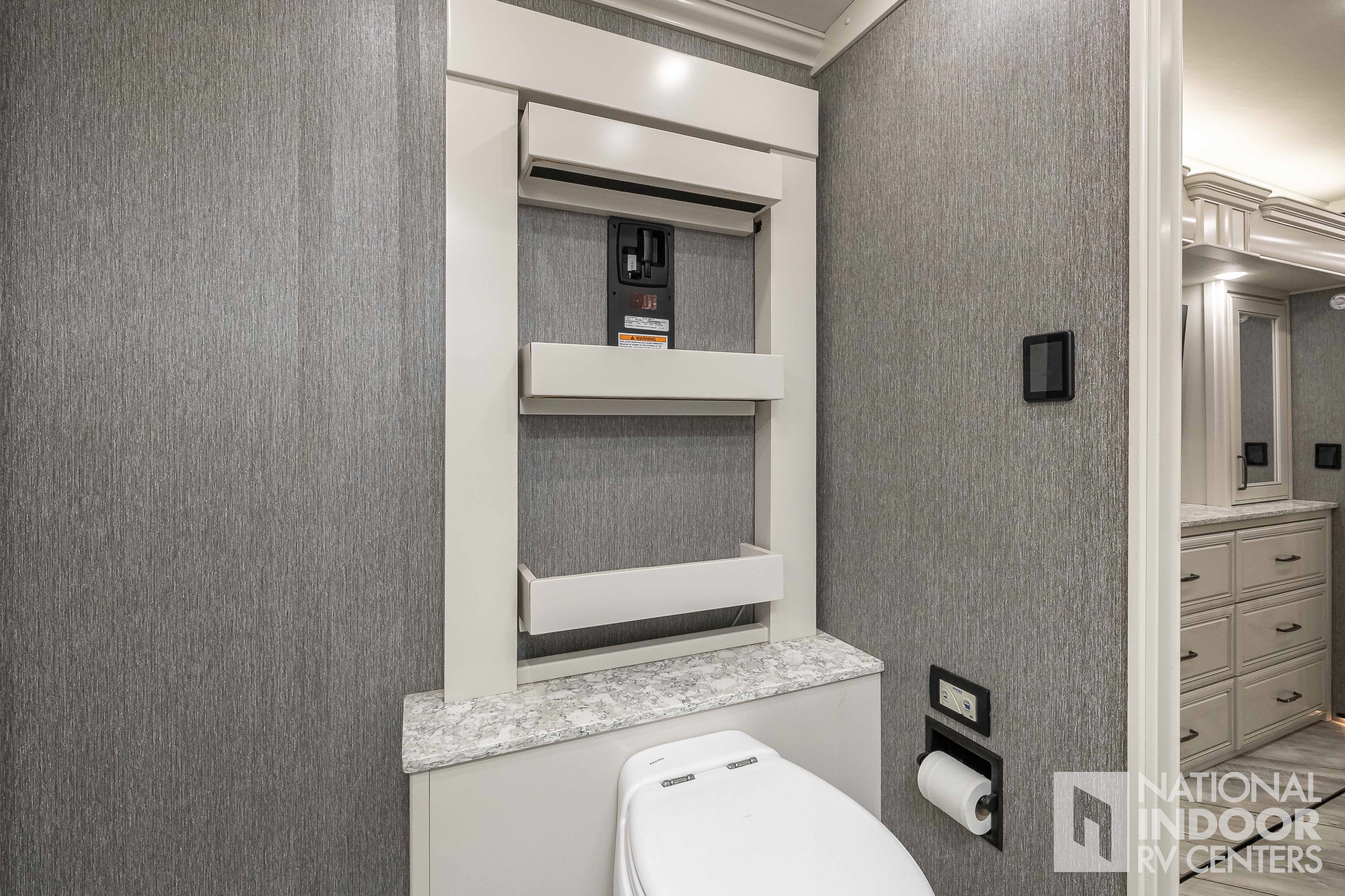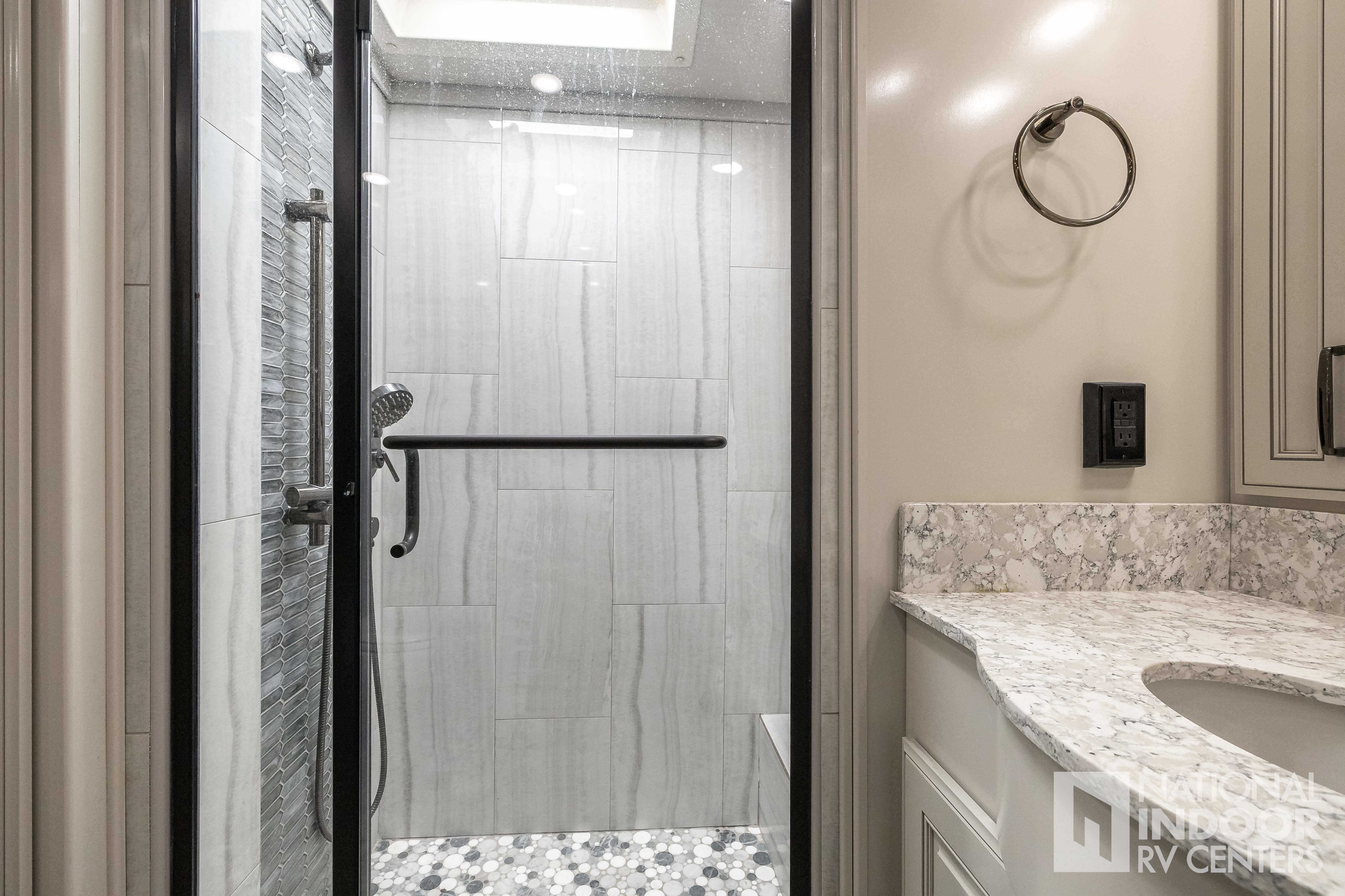 Freightliner Chassis - 605HP ISX, King Bed in Master Suite, Bath and a Half, Double Vanity in Master Bath, Washer & Dryer, Heated Porcelain Tile Floor, Motion Power Lounge, Residential Appliances, Booth Dinette, 2 x 460Ah Lithium Batteries, Blu Filter & Blu Softener, Magna Shades & Tire Covers!